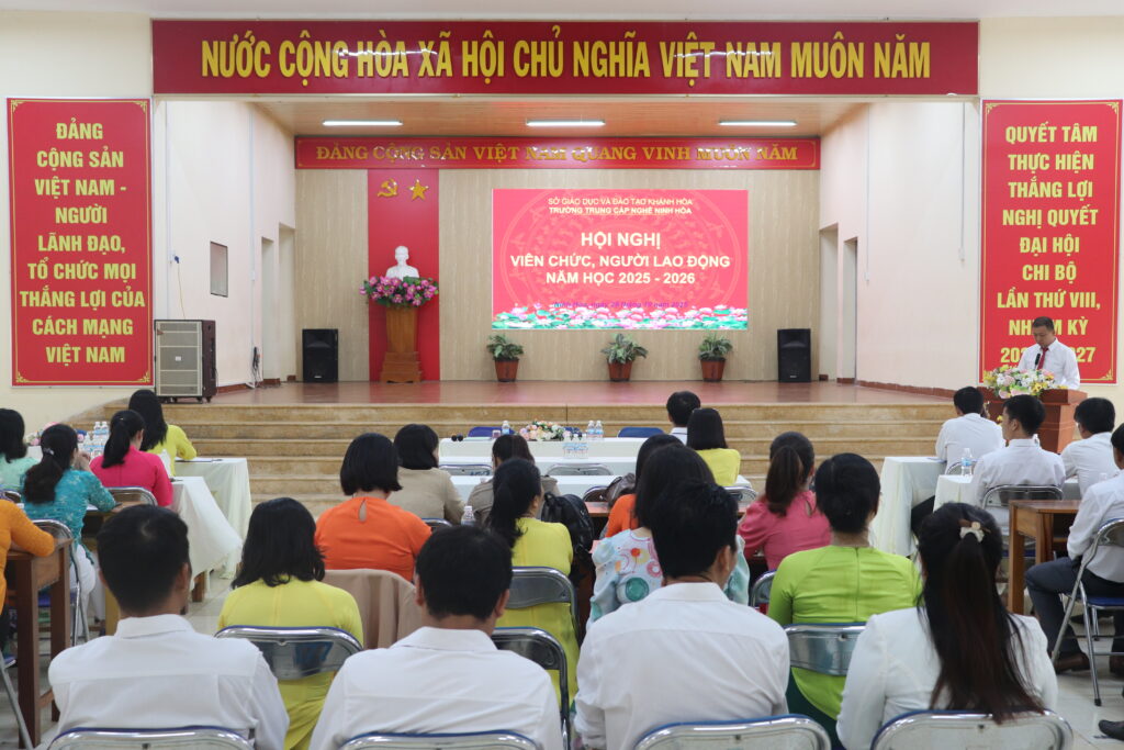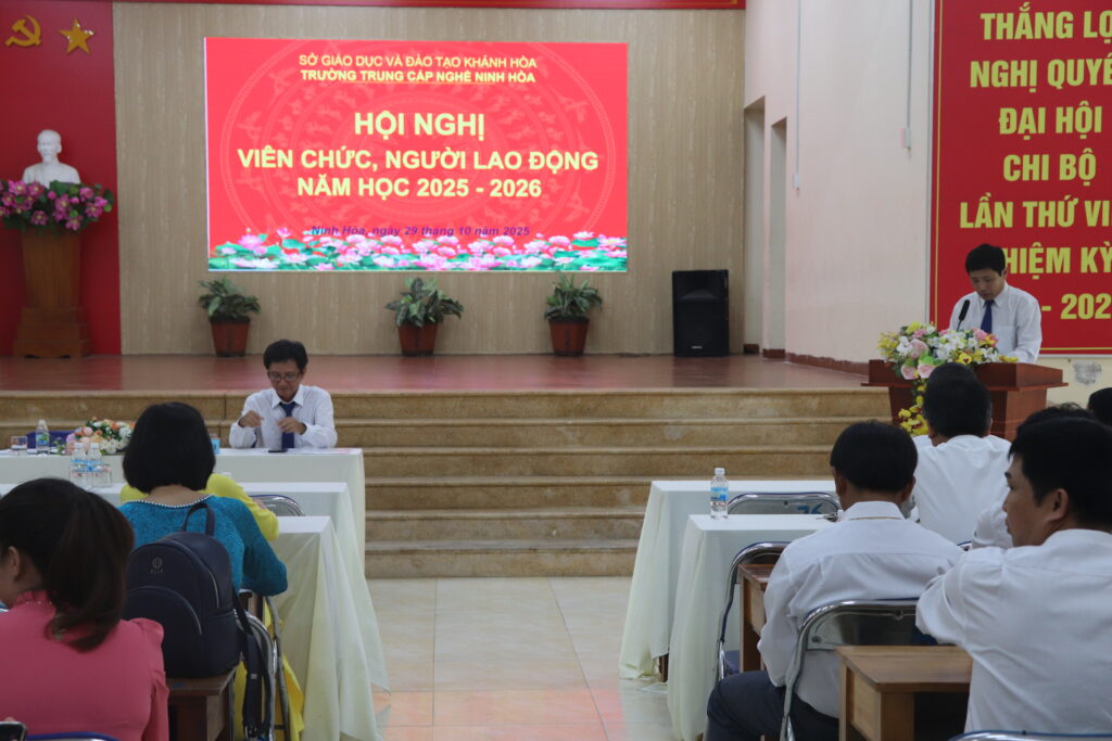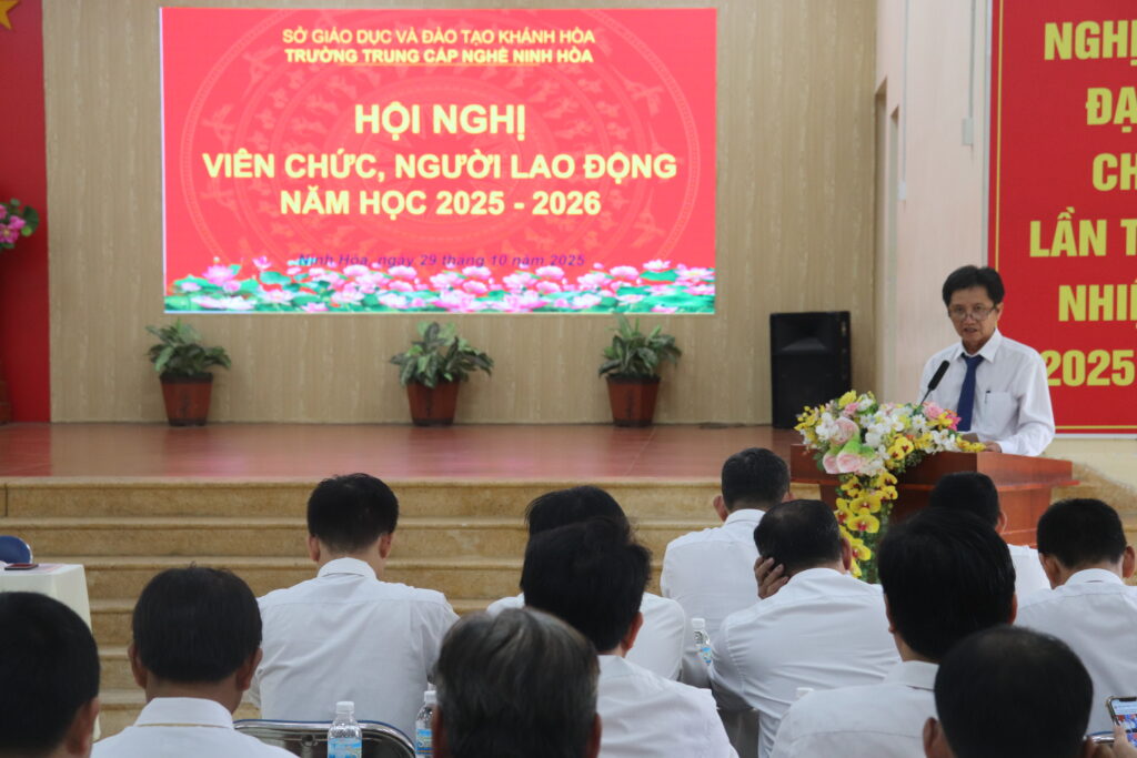 Chiều ngày 29/10/2025, Trường Trung cấp nghề Ninh Hoà tổ chức Hội nghị viên chức, người lao động năm học 2025 – 2026. Đến dự Hội nghị có ông Mạc Tiến Hưng – Bí thư chi bộ, Hiệu trưởng nhà trường; các đồng chí trong Ban Giám hiệu và toàn thể viên chức, người lao động của đơn vị.