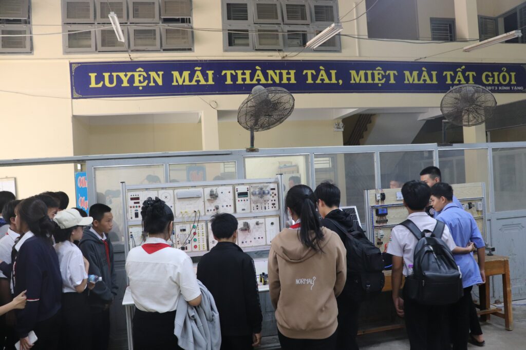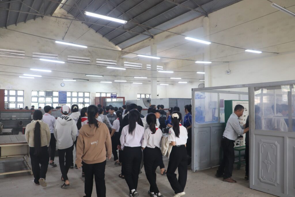 Cuối buổi lễ, các em được tham quan trực tiếp các mô hình đào tạo và trang thiết bị rèn luyện kỹ năng nghề tại các nhà xưởng thực hành, các phòng học chuyên môn của nhà trường. Tại đây, các em cũng được giải đáp chi tiết các thắc mắc về điều kiện xét tuyển và môi trường thực hành tay nghề.